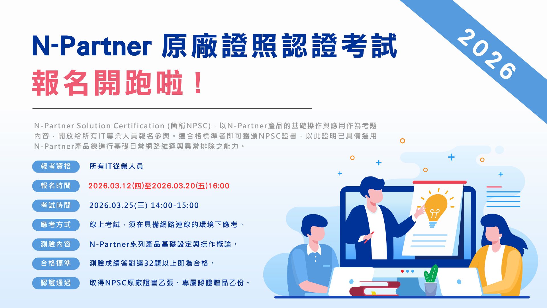2026年首場次 N-Partner Solution Certification (NPSC)證照考試,將於03/25(三)進行!
