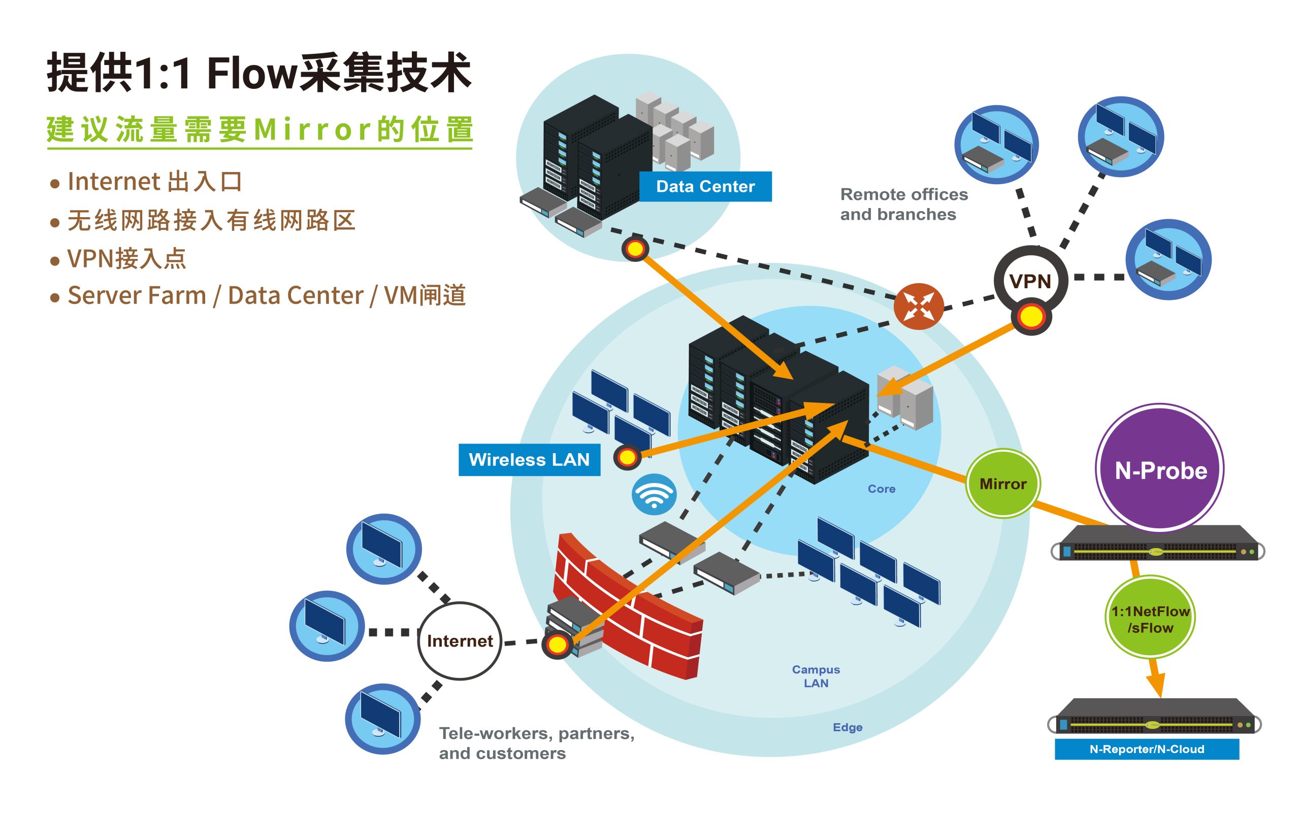 - N-Probe可将Mirror流量转换成1:1 NetFlow资料格式输出到流量分析系统进行后续的分析工作,让网路管理变的更加轻松